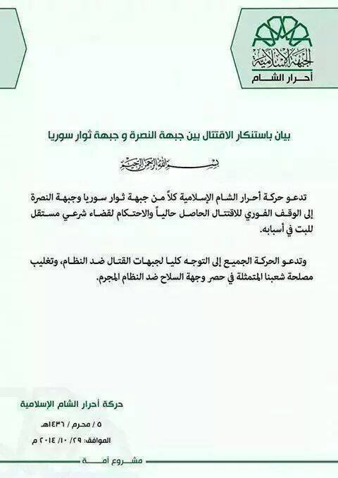 بيان من حركة أحرار الشام الإسلامية تدعو فيه جبهة ثوار سورية وجبهة النصرة لوقف الاقتتال فيما بينهما والاحتكام لقضاء شرعي مستقل