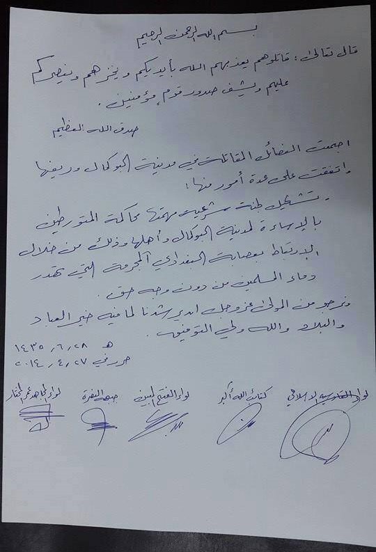 تشكيل لجنة شرعية مهمتها محاكمة المتورطين بالإساءة لمدينة البوكمال وأهلها وكذلك من خلال الارتباط بعصابة البغدادي المجرمة التي تهدر دماء المسلمين من دون وجه حق.