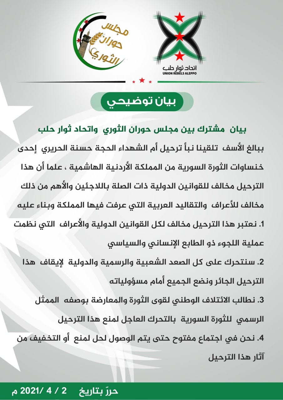 بيان من مجلس حوران الثوري حول ترحيل الأردن حسنة الحريري إحدى نساء درعا من أراضيها