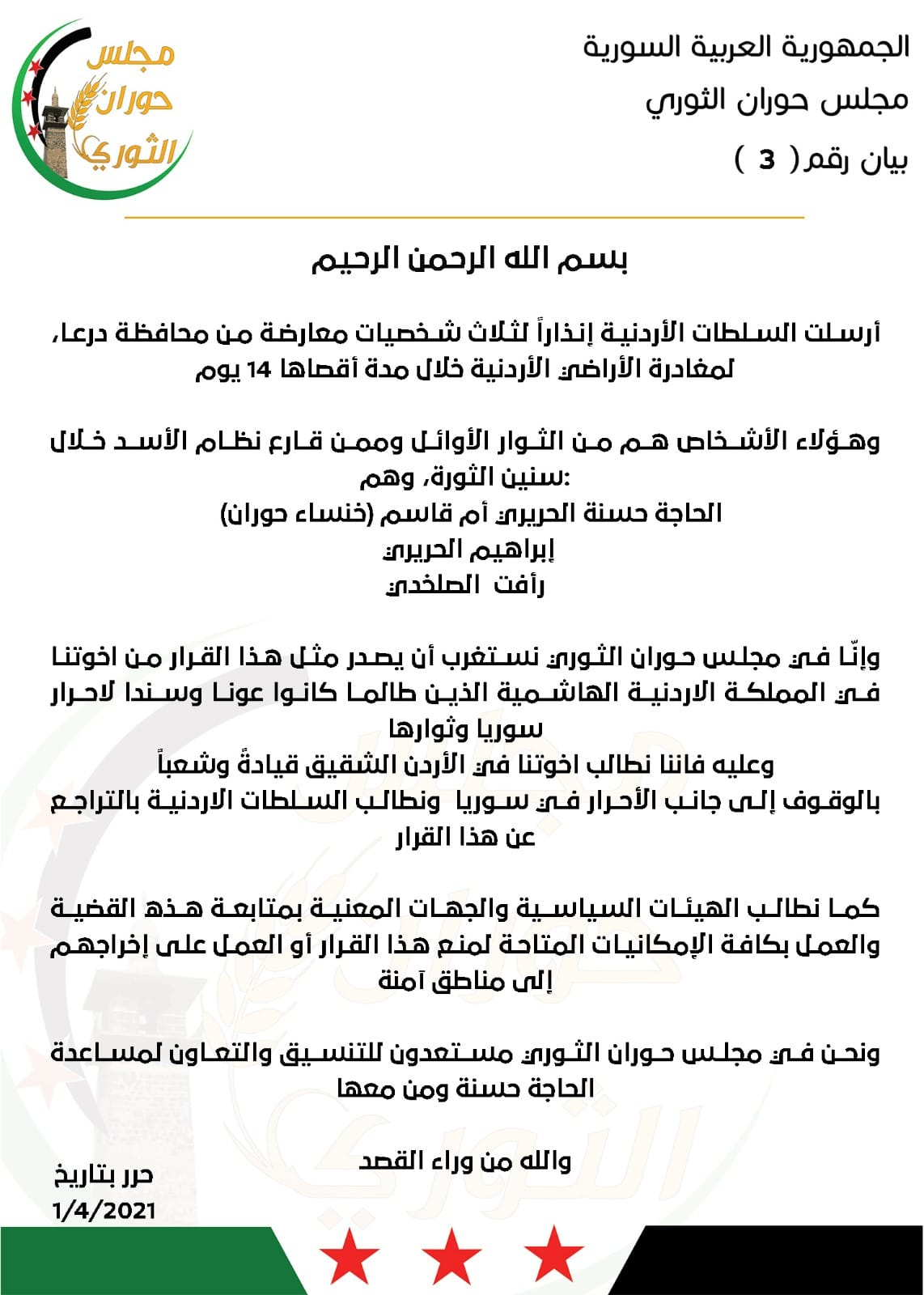 بيان مجلس حوران الثوري لمطالبة الأردن بوقف ترحيل حسنة الحريري وإبراهيم الحريري ورأفت الصلخدي