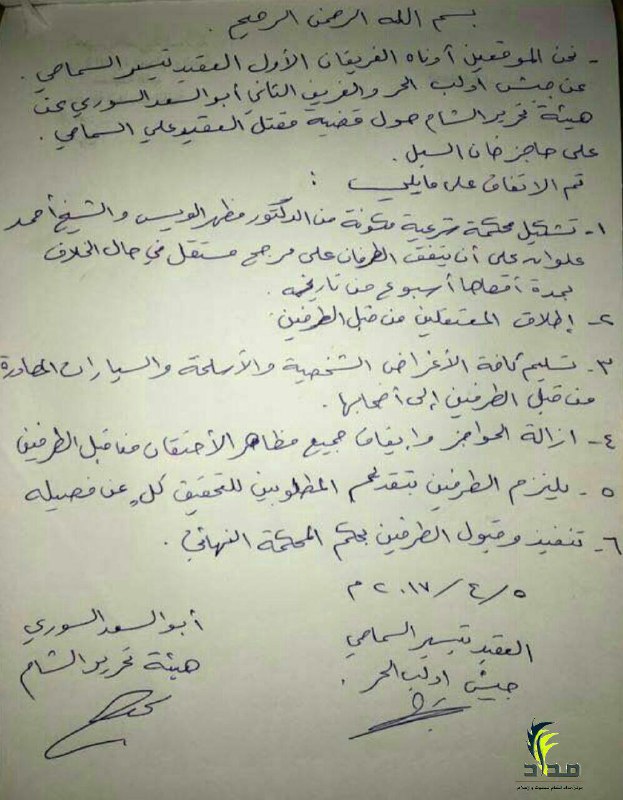 نحن الموقعين أدنا الفريقان الأول العقيد تيسير السماحي، عن جيش إدلب الحر والفريق الثاني أبو السعد السوري عن هيئة تحرير الشام حول قضية مقتل العقيد علي السماحي على حاجز خان السبل.