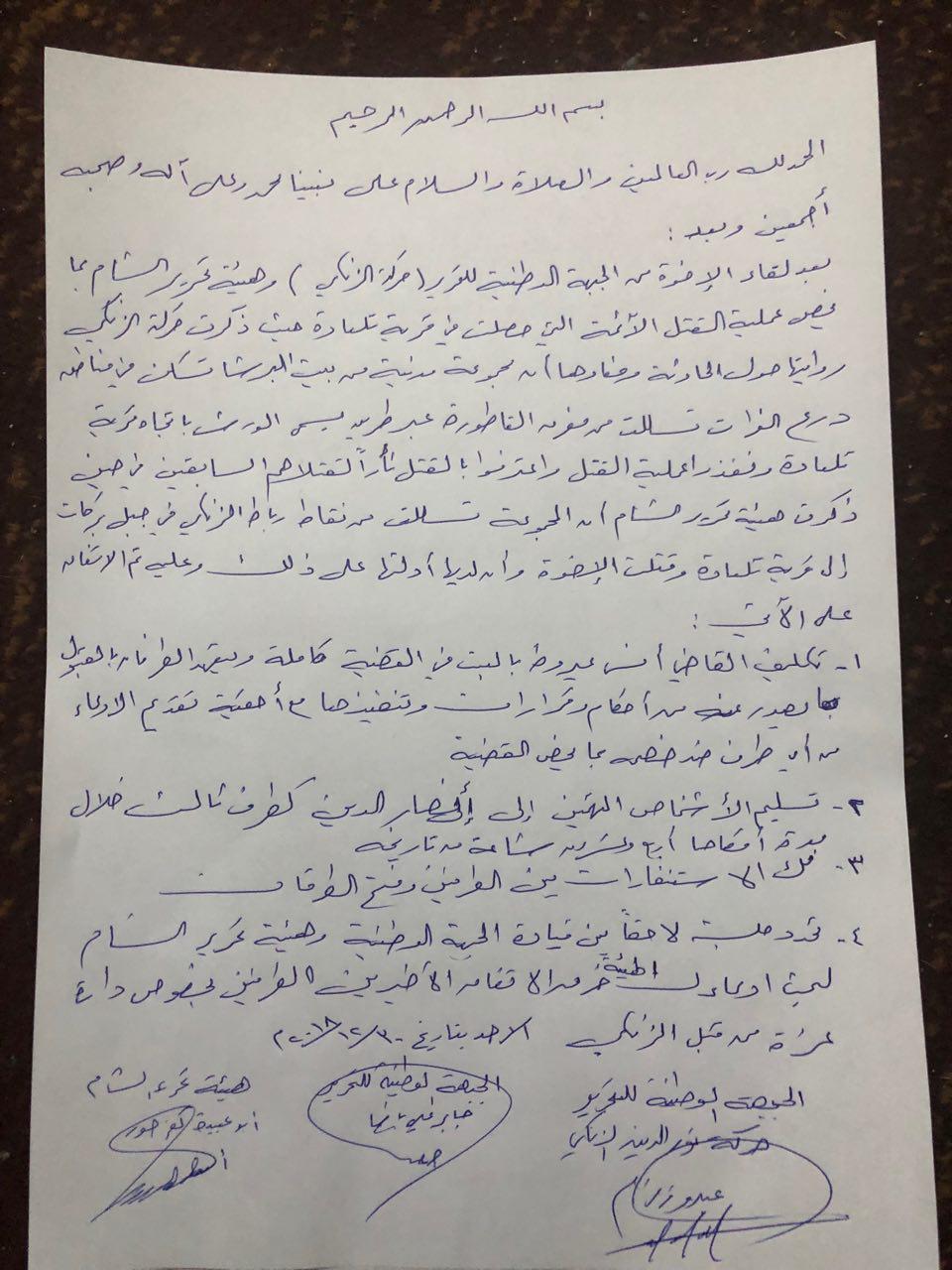 بعد لقاء الإخوة من الجبهة الوطنية للتحرير (حركة الزنكي) وهيئة تحرير الشام بما يخص عملية القتل الآثمة التي حصلت في قرية تلعادة حيث ذكرت حركة الزنكي روايتها حول الحادثة ومفادها أن مجموعة، مدنية من بيت البرشا تسكن في مناطق درع الفرات تسللت من مفرق الناطورة عبر طريق يسمى الورش باتجاه قرية تلعادة وفقدان عملية القتل واعترفوا بالقتل ثأراً لقتلاهم السابقين في حين ذكرت هيئة تحرير الشام أن المجموعة تسللت من نقاط رباط الزنكي في جبل بركات إلى قرية تلعادة وقتلت الإخوة وأن لديها أدلتها على ذلك وعليه تم الاتفاق على الآتي: