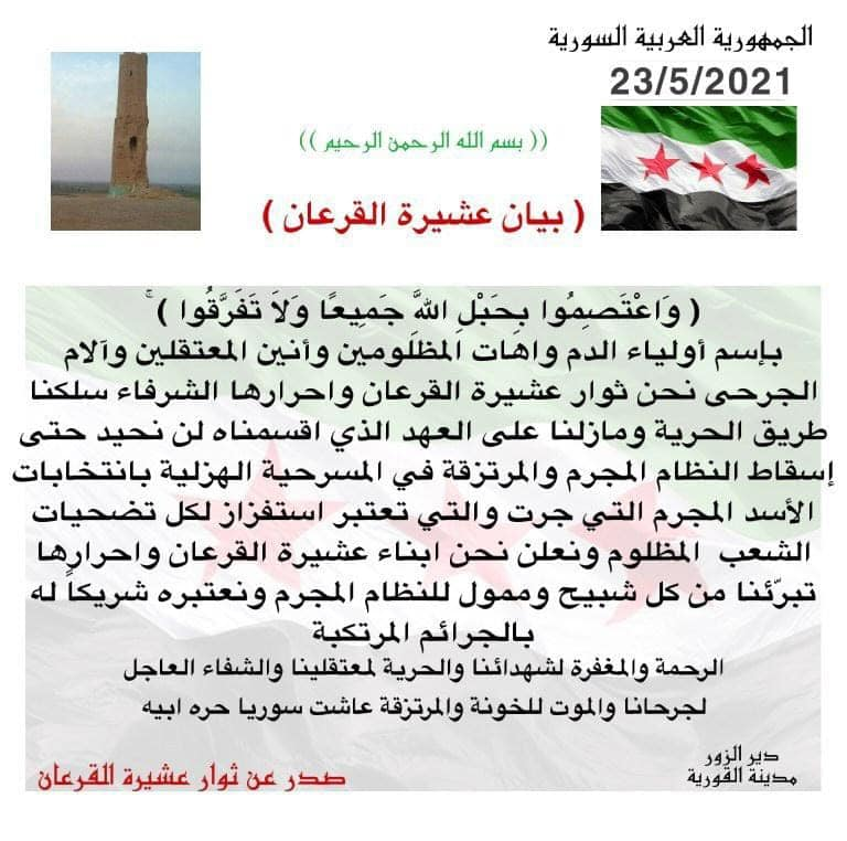 بيان من عشيرة القرعان يندد بإجراء الانتخابات الرئاسية في سورية ويدعو أبناء العشيرة لعدم المشاركة فيها