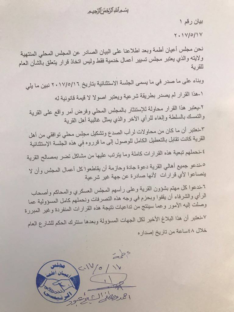 بيان من مجلس أعيان أطمة يؤكد فيه رفضه لبعض قرارات المجلس المحلي لأطمة والمجلس العسكري
