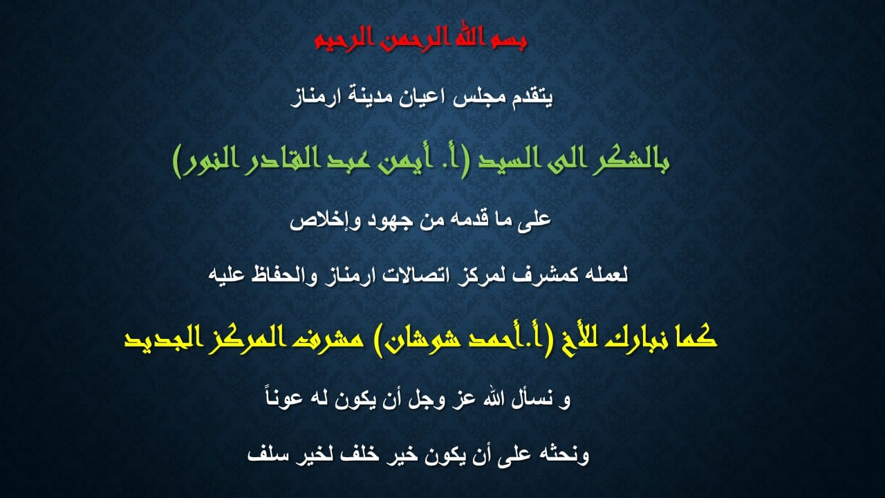 بطاقة شكر من مجلس أعيان أرمناز لمدير مركز الاتصالات في المدينة على جهوده في الحفاظ على المركز، مع المباركة للمسؤول الجديد على المركز