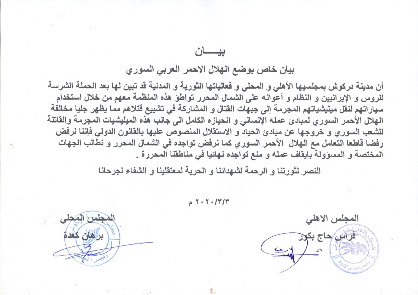 بيان من المجلسين الأهلي والمحلي في دركوش لرفض لتواجد الهلال الأحمر السوري في المناطق المحررة