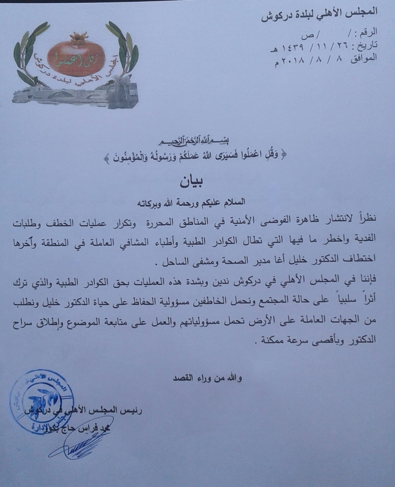 بيان إدانة من المجلس لعمليات الخطف وفوضى الفلتان الأمني في المحرر وآخرها خطف الدكتور خليل آغا