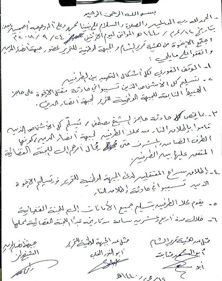 بتاريخ 14/محرم/1440هـ الموافق لـيوم الاثنبن 24/9/2018 م اجتمع الإخوة من هيئة تحرير الشام والجبهة الوطنية للتحرير بحضور جبهة أنصار الدين، واتفقوا على ما يلي: