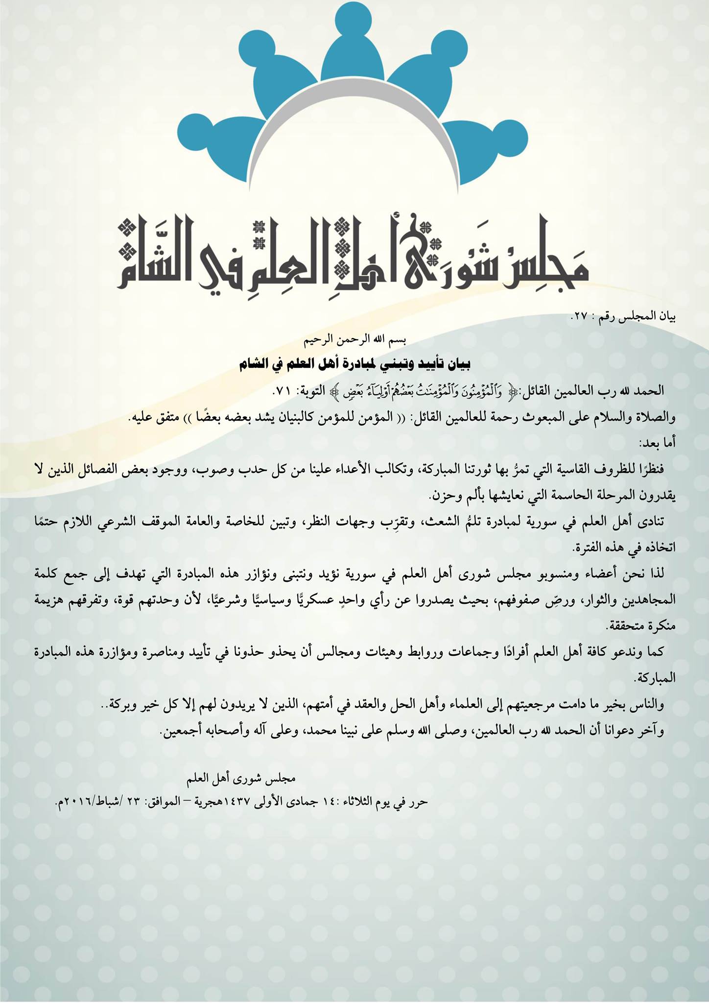 بيان تأييد وتبني من مجلس شورى أهل العلم في الشام لمبادرة أهل العلم في الشام حول توحيد الفصائل