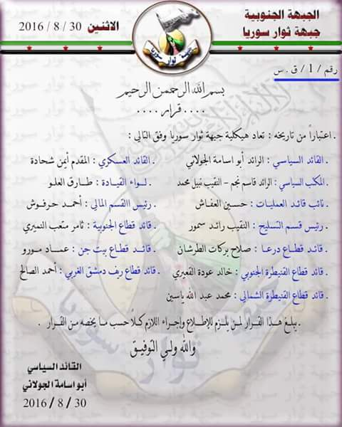إعلان جبهة ثوار سوريا- قطاع جنوب سوريا عن هيكليتها الجديدة