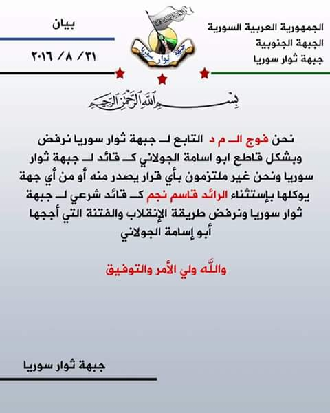 بيان من فوج الـ م د في جبهة ثوار سوريا- جنوب سوريا بعدم اعترافه بالقيادة الجديدة والتزامه بالاعتراف بالقيادة السابقة