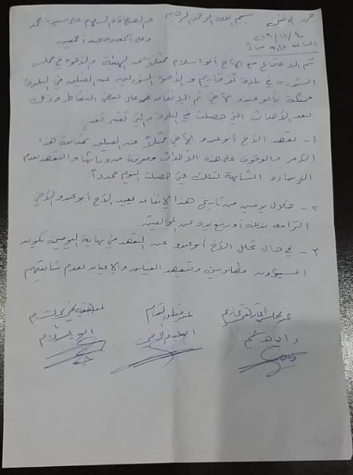 3- في حال تحلل الأخ أبو عبدو عن التعهد في نهاية اليومين يكون المسيؤون مطلوبين ويتعهد الفيلق والأعيان بعدم متابعتهم.