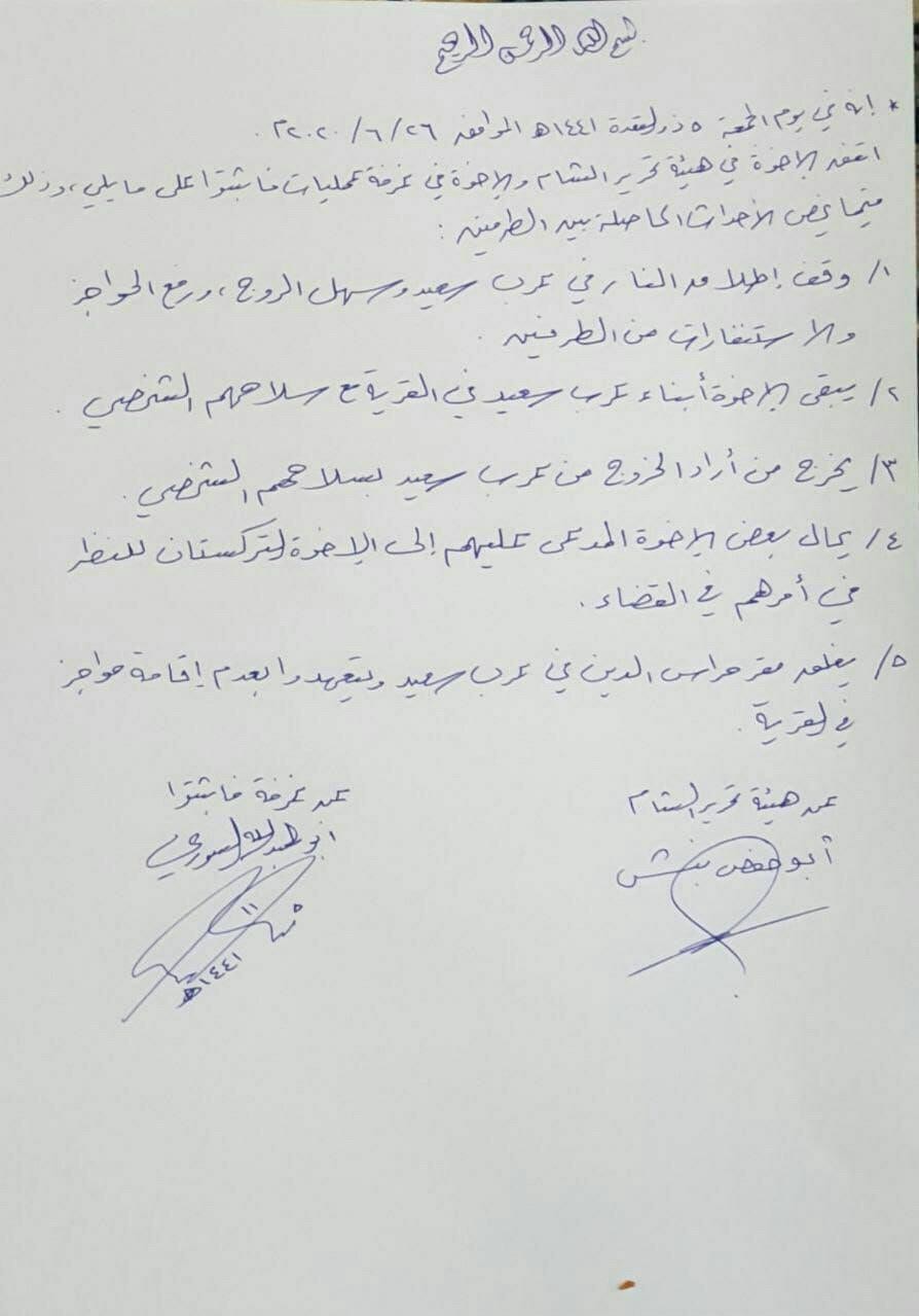 5- يغلق مقر حراس الدين في عرب سعيد ويتعهد بعدم إقامة حواجز في القرية,