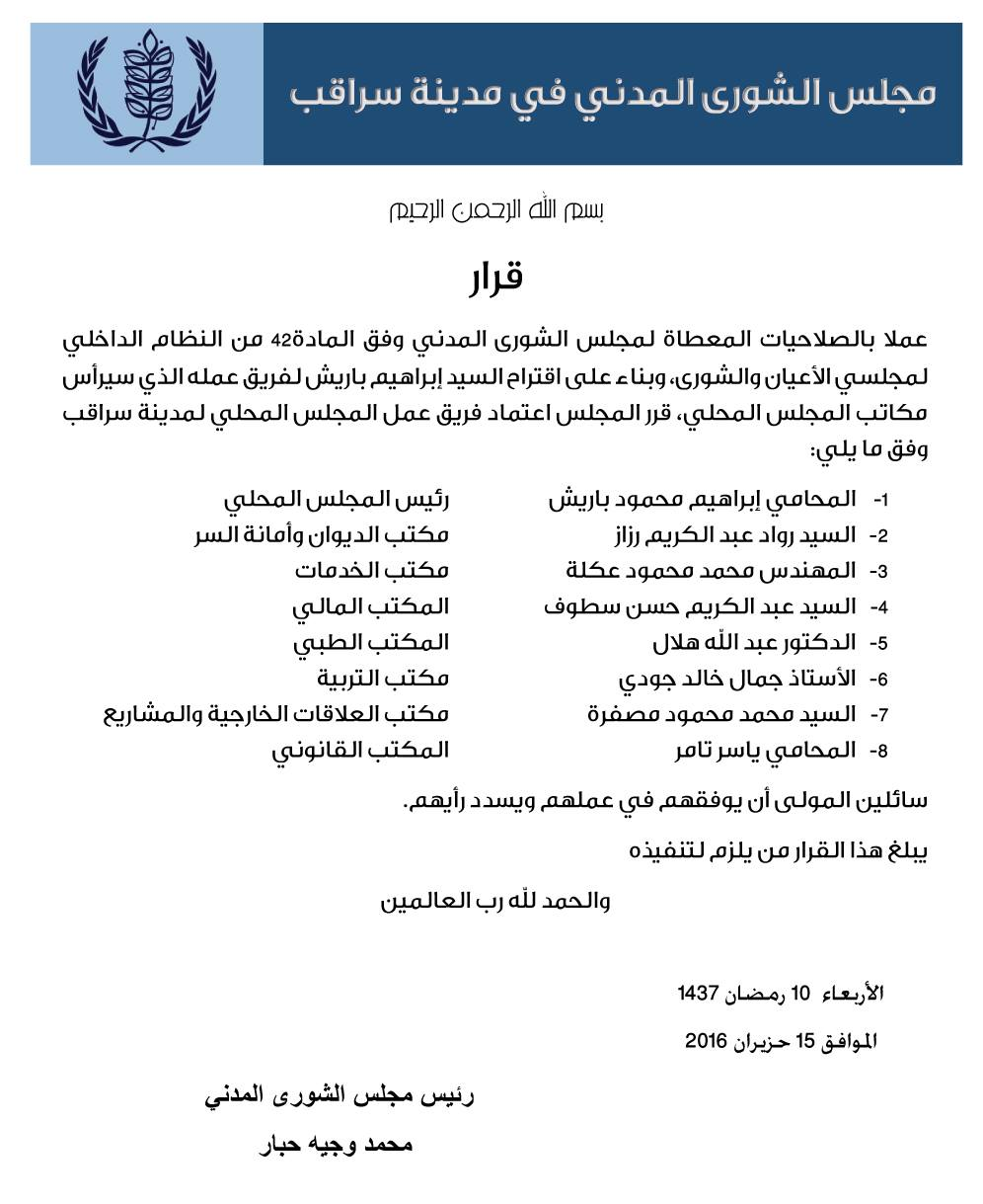 قرار مجلس الشورى المدني في سراقب باعتماد أعضاء مجلس المدينة المحلي
