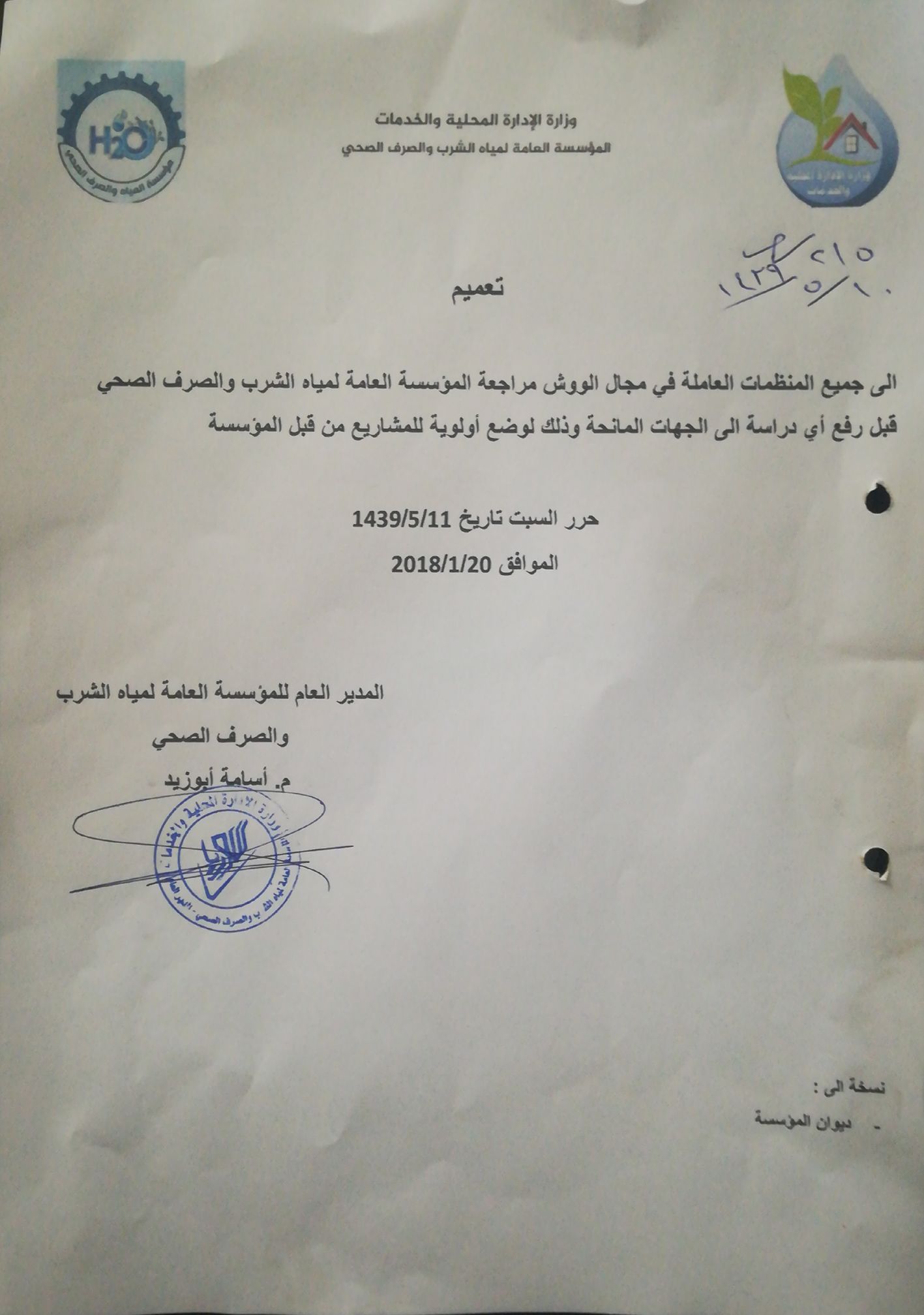 تعميم من المؤسسة العامة لمياه الشرب إلى جميع المنظمات العاملة في مجال الووش