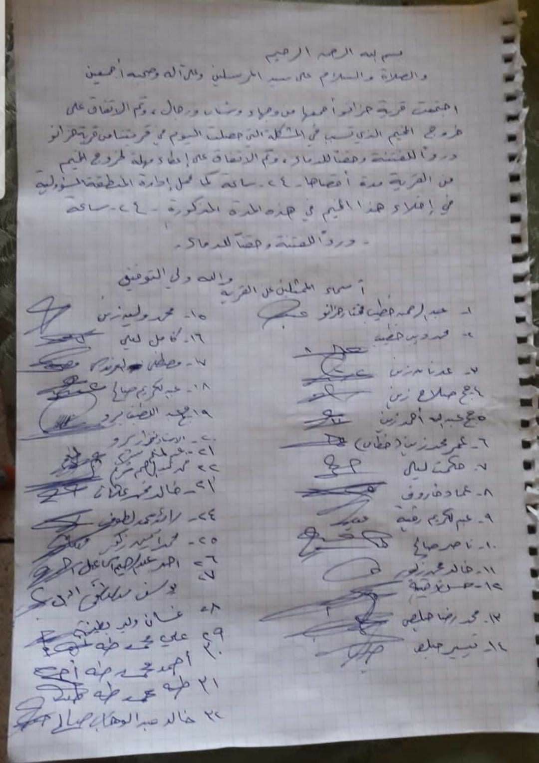 اجتمعت قرية حزانو أجمعها من وجهاء وشباب ورجال، وتم الاتفاق على خروج المخيم الذي تسبب في المشكلة التي حصلت اليوم في قريتنا قرية حزانو درءاً للفتنة وحقناً للدماء، وتم الاتفاق على إعطاء مهلة لخروج المخيم من القرية مدة أقصاها 24 ساعة .