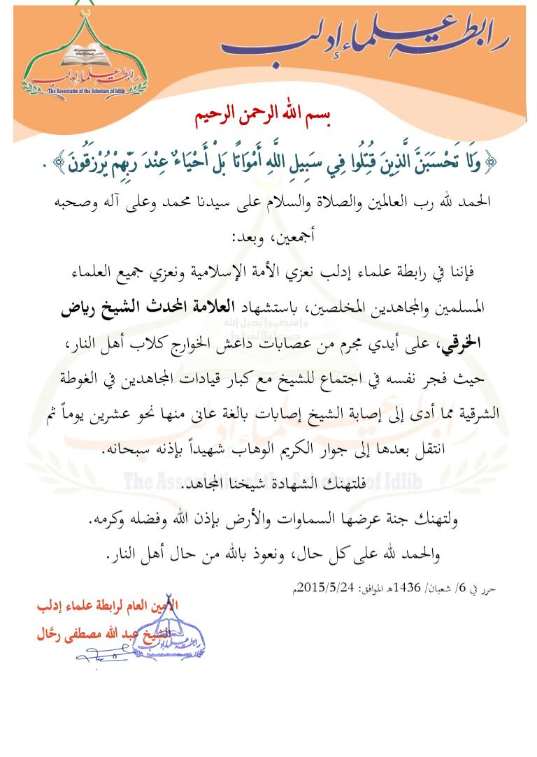 بيان تعزية من رابطة علماء إدلب بالشيخ رياض الخرقي