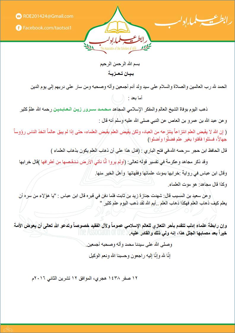 بيان تعزية من رابطة علماء إدلب بالشيخ محمد سرور زين العابدين