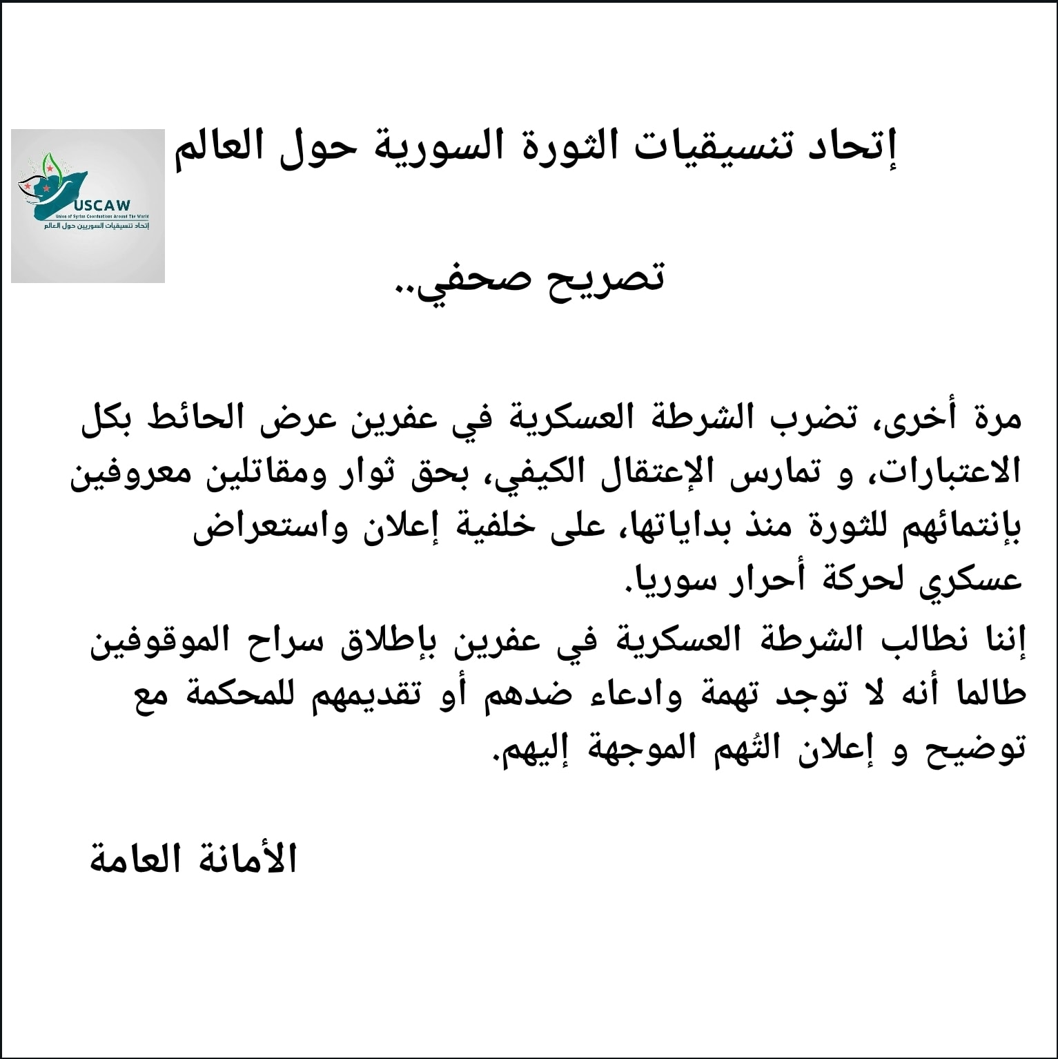 تصريح من اتحاد تنسيقيات السوريين حول العالم بضرورة كف يد الشرطة العسكرية بعفرين عن الاعتقالات الكيفية وإطلاق سراح الموقوفين