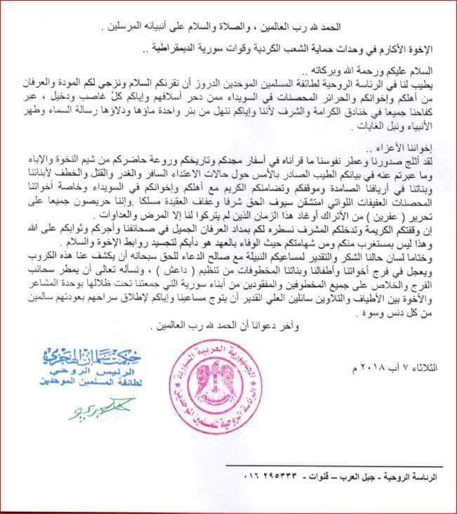 رسالة الرئاسة الروحية لطائفة المسلمين الموحدين لوحدات حماية الشعب الكردية لدعم نضالهم لتحرير عفرين وضد داعش والجيش التركي