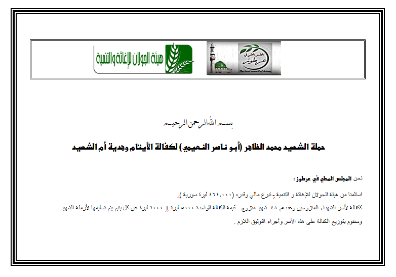 بيان من المجلس المحلي في عرطوز يؤكد فيه استلامه من هيئة الجولان للإغاثة و التنمية - تبرع مالي ككفالة لأسر الشهداء المتزوجين