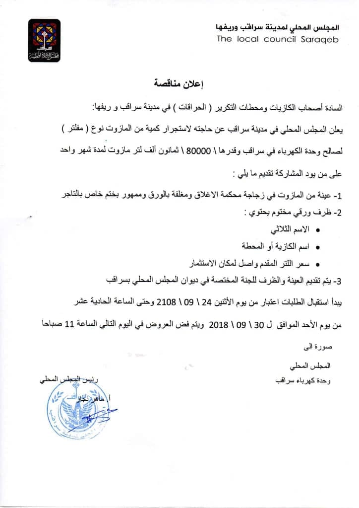 بيان من المجلس المحلي يعلن فيه عن مناقصة لاستجرار كمية من مادة المازوت لصالح وحدة كهرباء سراقب