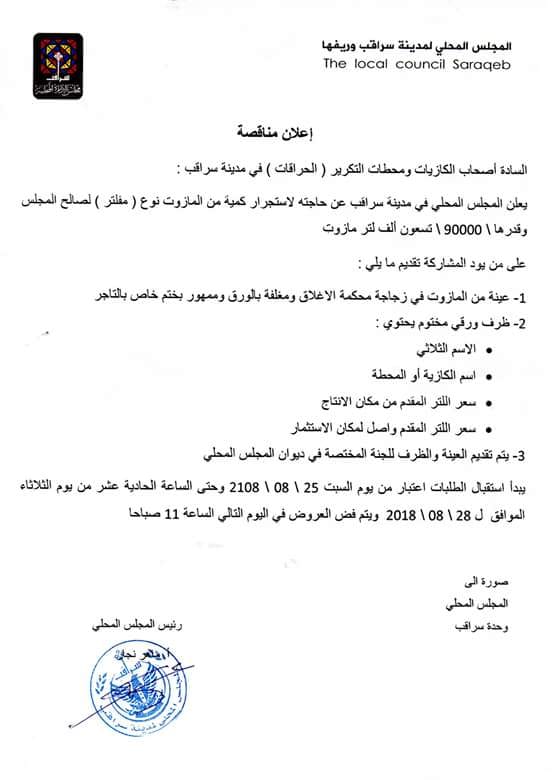 بيان من المجلس المحلي يعلن فيه عن رغبته إجراء مناقصة لاستجرار كمية من المازوت لصالح المجلس