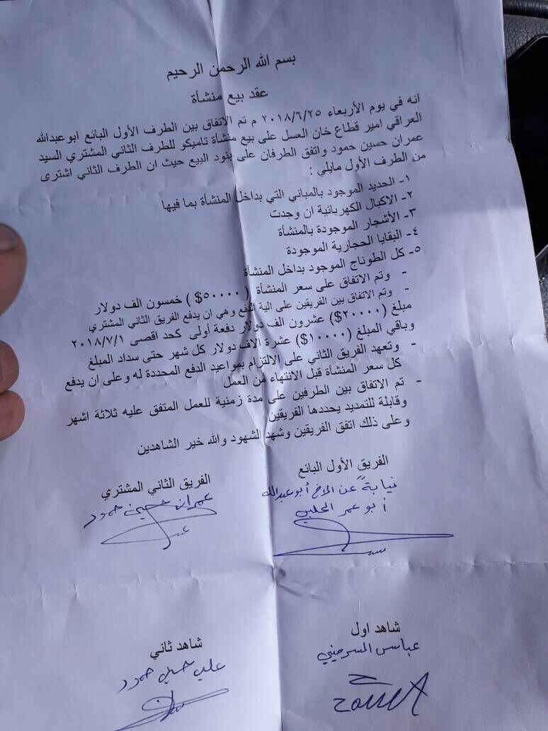 إنه في يوم الأربعاء 25/7/2018 م تم الاتفاق بين الطرف الأول البائع أبو عبد الله العراقي أمير قطاع خان العسل على بيع منشأة تاميكو للطرف الثاني المشتري السيد عمران حسين حمود واتفق الطرفان على بنود البيع حيث أن الطرف الثاني اشترى من الطرف الأول ما يلي: