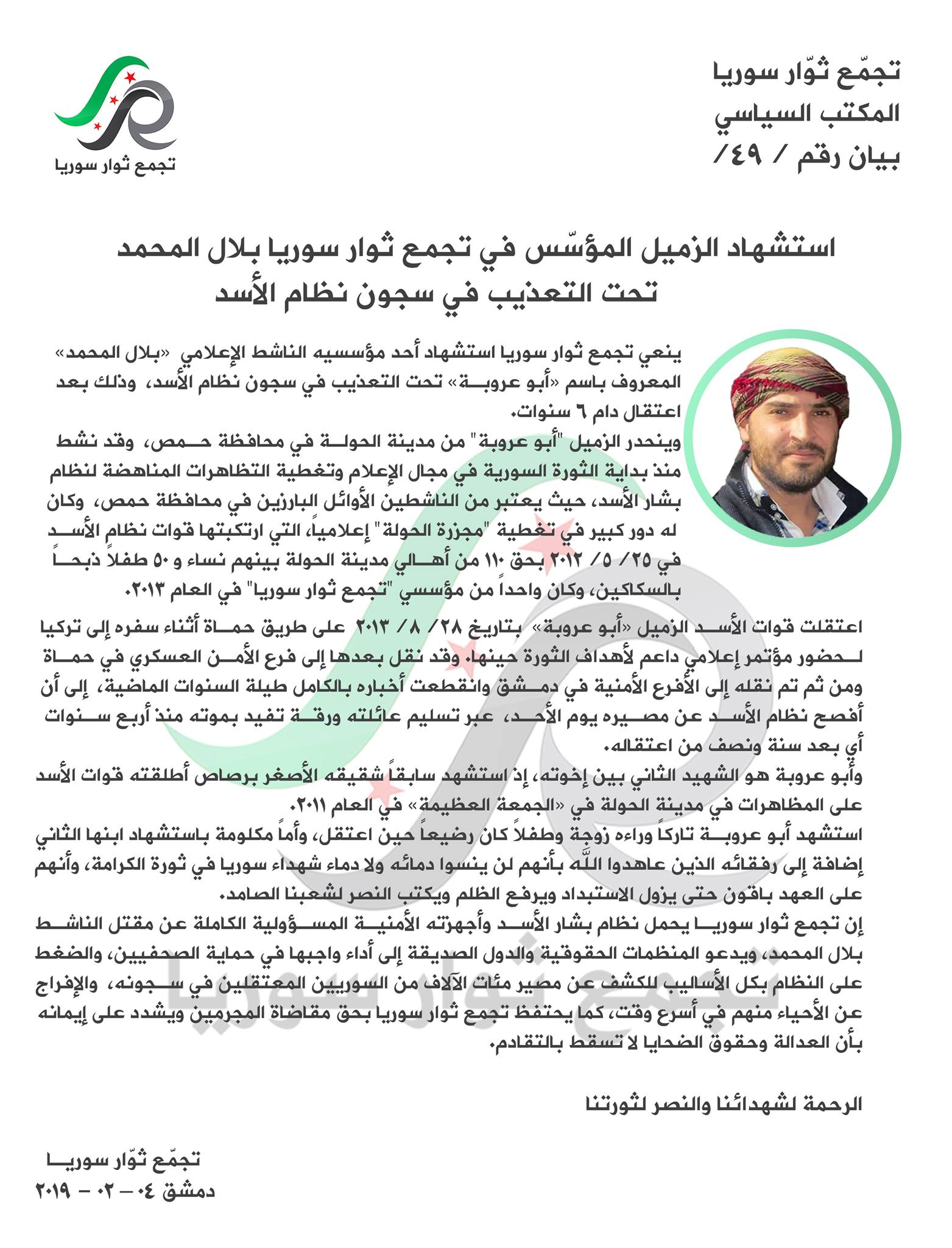 ينعي تجمع ثوار سوريا استشهاد أحد مؤسسيه الناشط الإعلامي بلال المحمد، المعروف باسم "أبو عروبة" تحت التعذيب في سجون نظام الأسد، وذلك بعد اعتقال دام 6 سنوات.