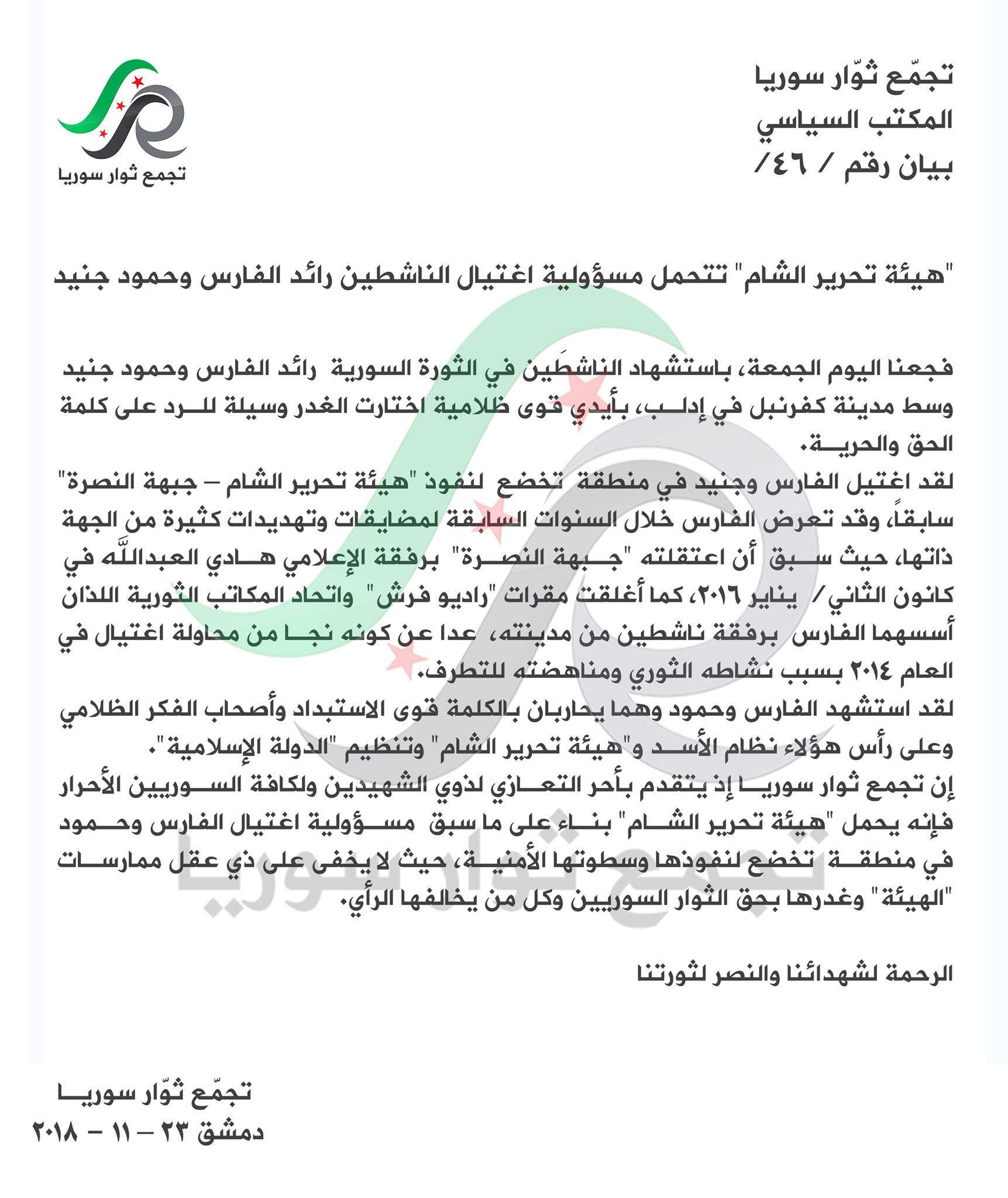 إن تجمع ثوار سوريا إذ يتقدم بأحر التعازي لذوي الشهيدين ولكافة السوريين الأحرار، فإنه يحمل "هيئة تحرير الشام" مسؤولية اغتيال الفارس وحمود في منطقة تخضع لنفوذها وسطوتها الأمنية بناء على ما سبق، حيث لا يخفى على ذي عقل ممارسات "الهيئة" وغدرها بحق الثوار السوريين وكل من يخالفها الرأي.