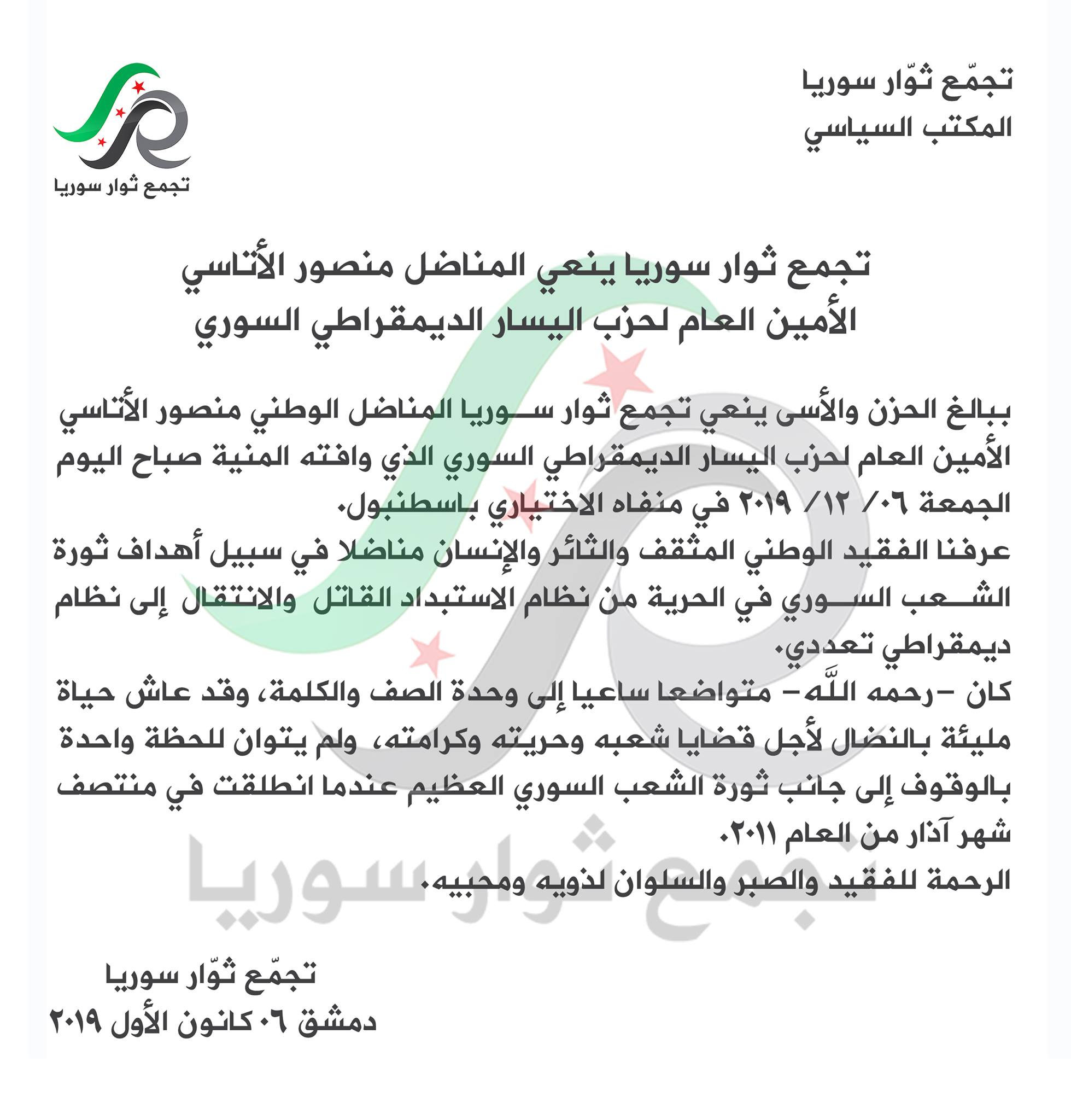 ببالغ الحزن والأسى ينعي تجمع ثوار سـوريا المناضل الوطني منصور الأتاسي الأمين العام لحزب اليسار الديمقراطي السوري الذي وافته المنية صباح اليوم الجمعة 06/12/2019 في منفاه الاختياري باسطنبول.