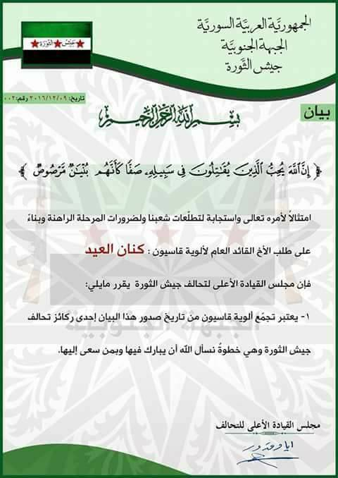 بيان انضمام ألوية قاسيون إلى تجمع جيش الثورة التابع للجبهة الجنوبية