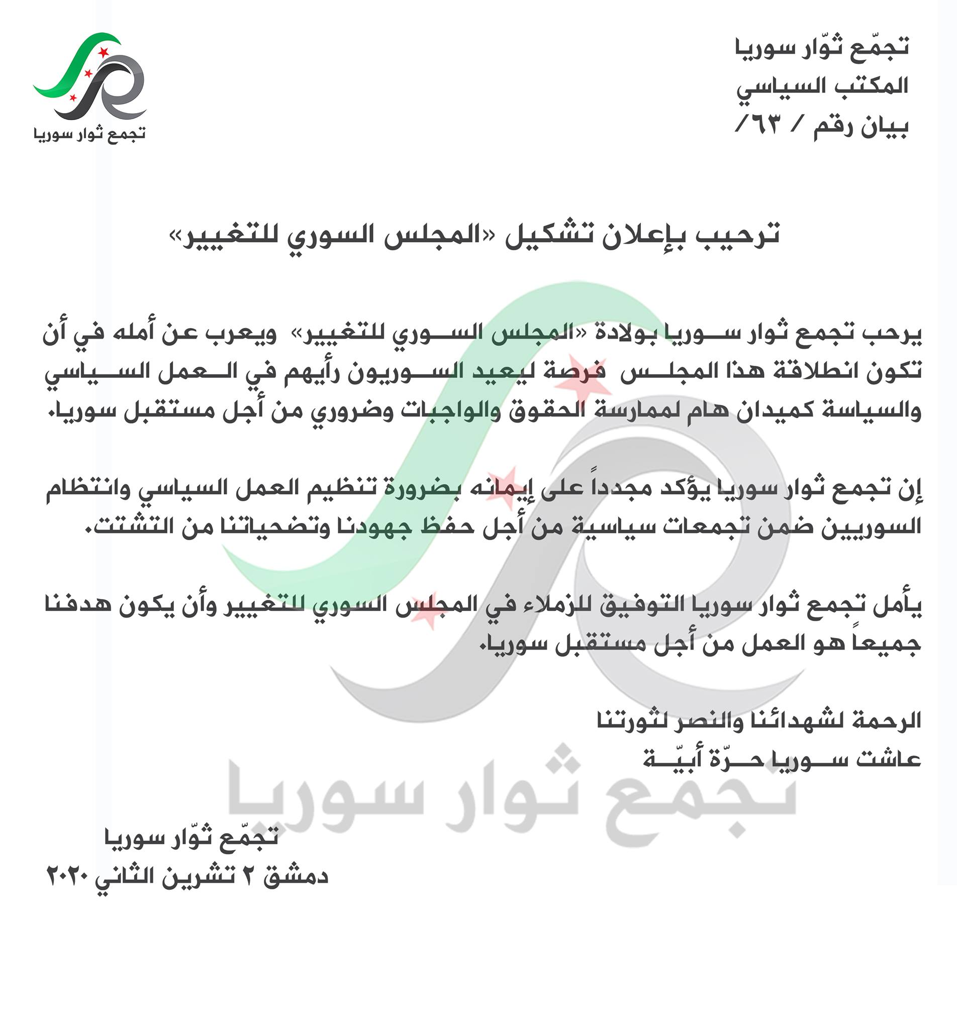 بيان تجمع ثوار سوريا للترحيب بتشكيل المجلس السوري للتغيير