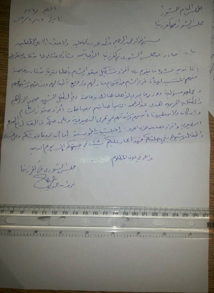 بيان مجلس شورى كفرزيتا حول ممارسات فصيل صقور الشام في بلدة شنان