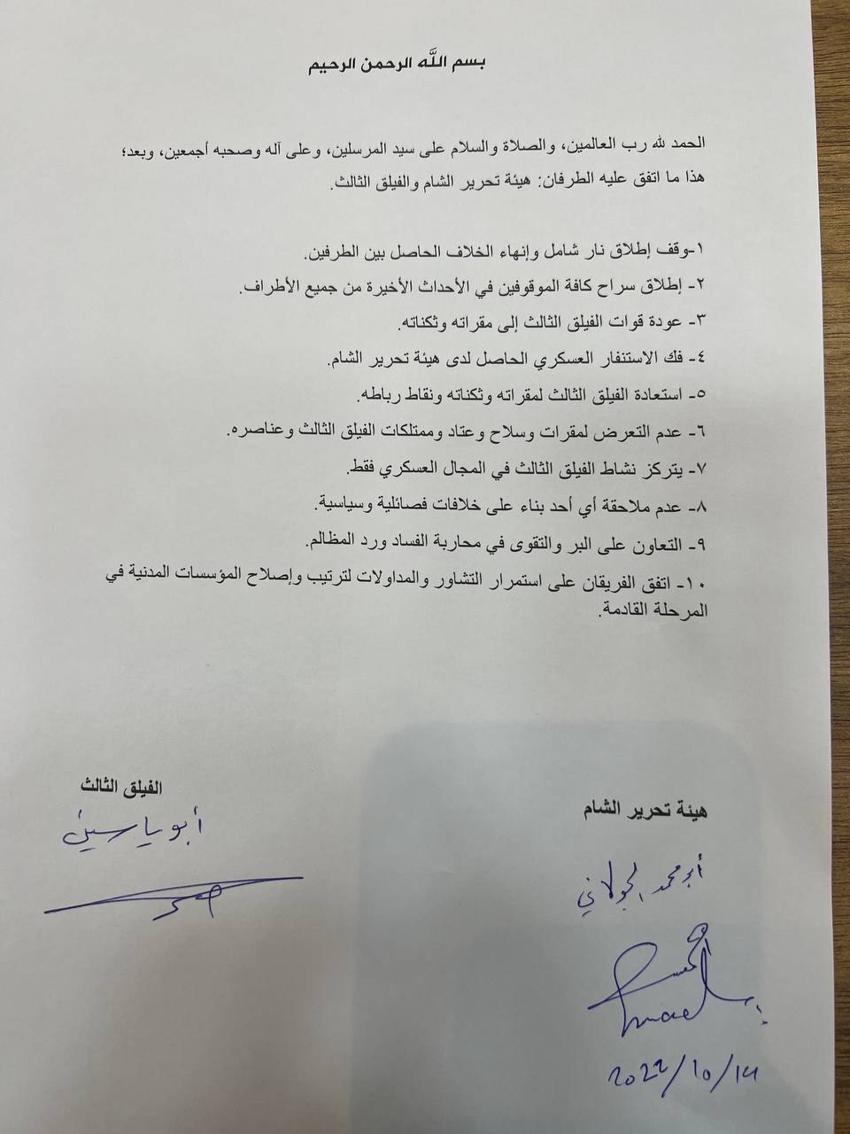 هذا ما اتفق عليه الطرفان: هيئة تحرير الشام والفيلق الثالث.