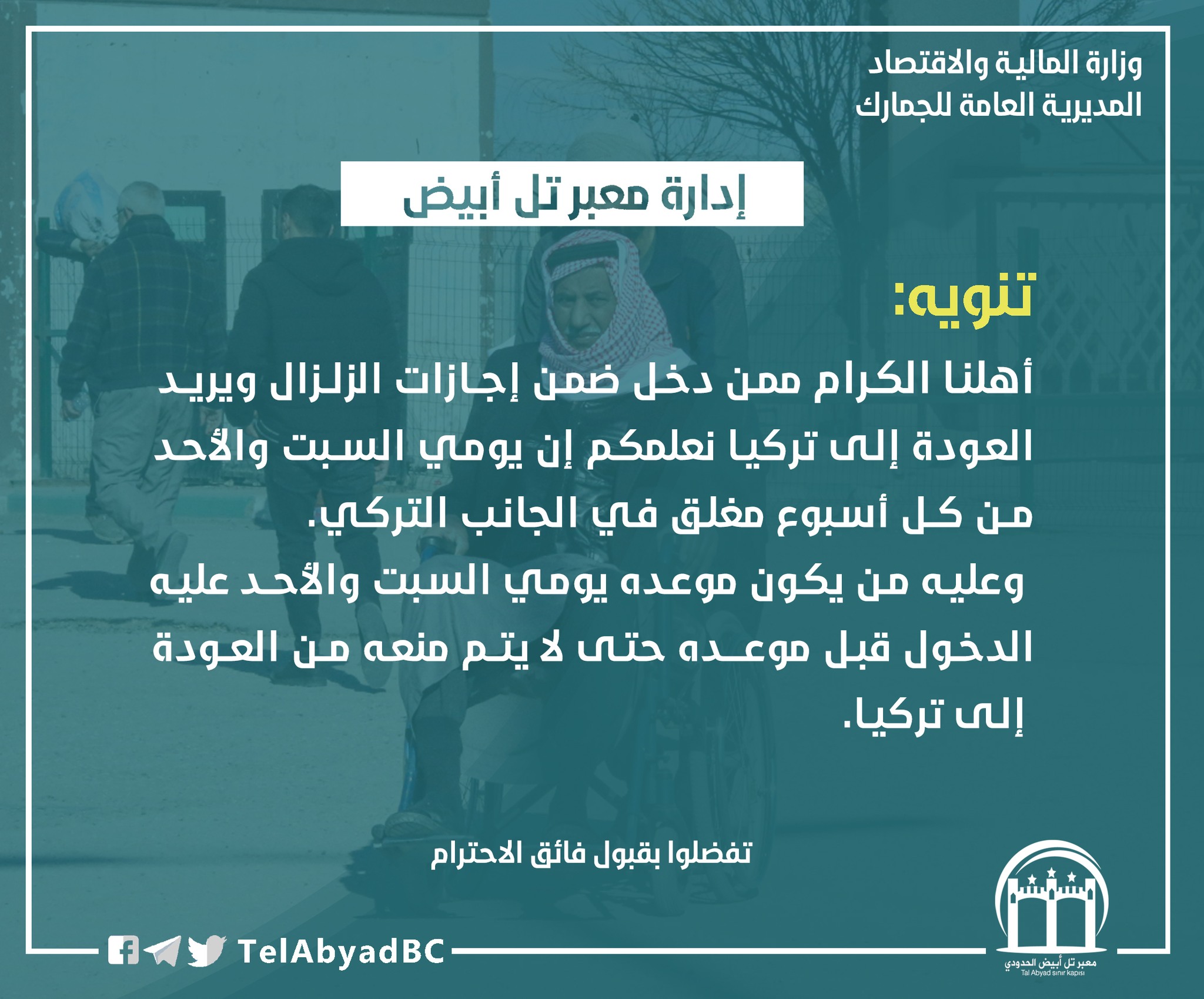 تنويه من إدارة معبر تل أبيض إلى الأهالي ممن دخل ضمن إجازات الزلزال ويريد العودة إلى تركيا