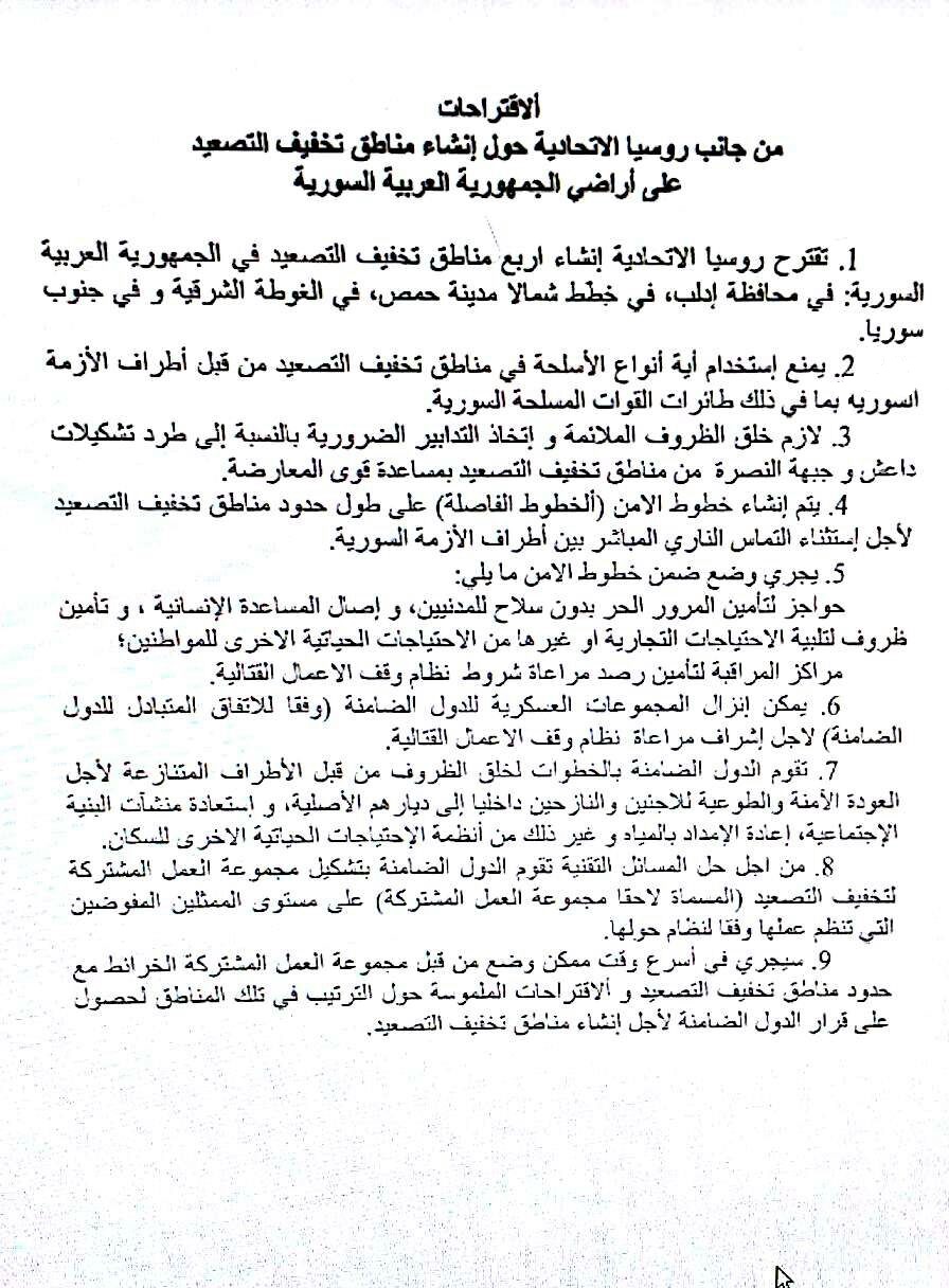 الاقتراحات من جانب روسيا الاتحادية حول إنشاء مناطق تخفيف التصعيد على أراضي الجمهورية العربية السورية