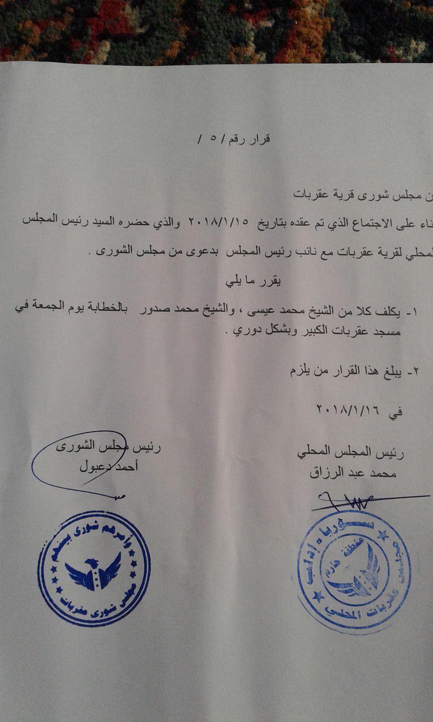 بيان من مجلس الشورى في قرية عقربات بشأن تكليف الخطباء في المسجد الكبير في البلدة