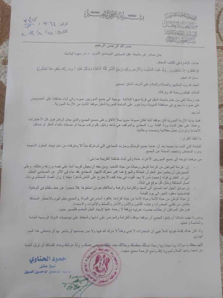 هذه الرسالة تلقى من مقام مشيخة العقل في قرية سهوة البلاطة موجهة إلى جميع السوريين عموما وإلى أبناء طائفتنا على الخصوص، على ضوء مايجري في محافظة السويداء ومايدور على الساحة السورية لنعلن موقفنا الثابت من الأزمة السورية، أما بعد