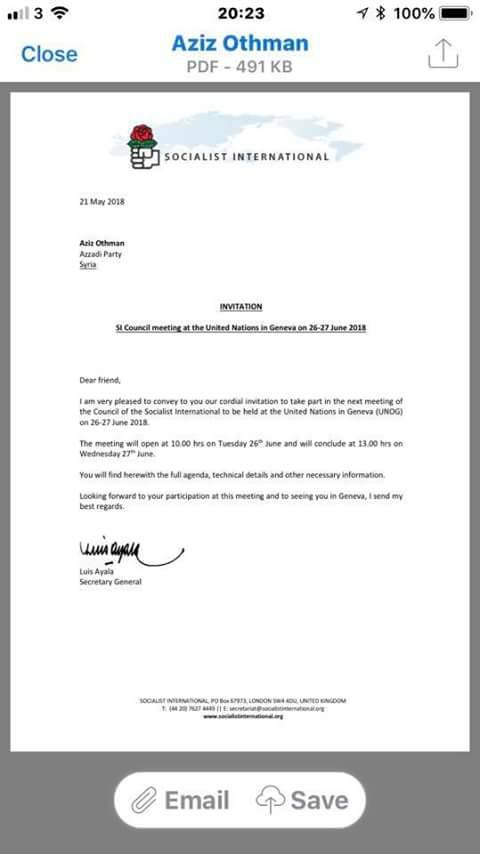 دعوة لوفد من الهيئة القيادية في حزب آزادي الكوردستاني لحضور اجتماع الأمانة العامة للاشتراكية الدولية في مقر الأمم المتحدة بجنيف