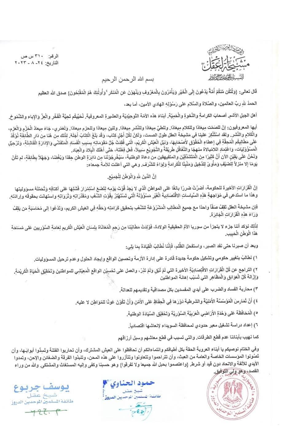 بيان مشيخة عقل طائفة الدروز بمطالبهم من النظام بالاستناد إلى الحراك الاحتجاجي الشعبي في محافظة السويداء