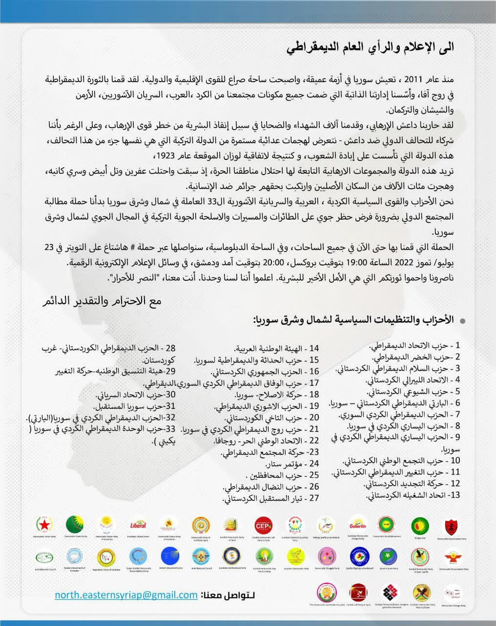 بيان لأحزاب كردية يطالب بفرض حظر جوي على الطائرات التركية في شمال وشرق سوريا