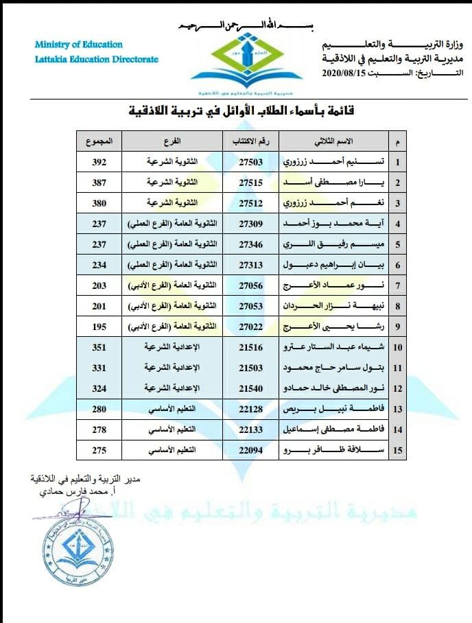 بيان من مديرية التربية الحرة في اللاذقية حول أسماء الطلاب المتفوقين في في امتحانات دورة 2020