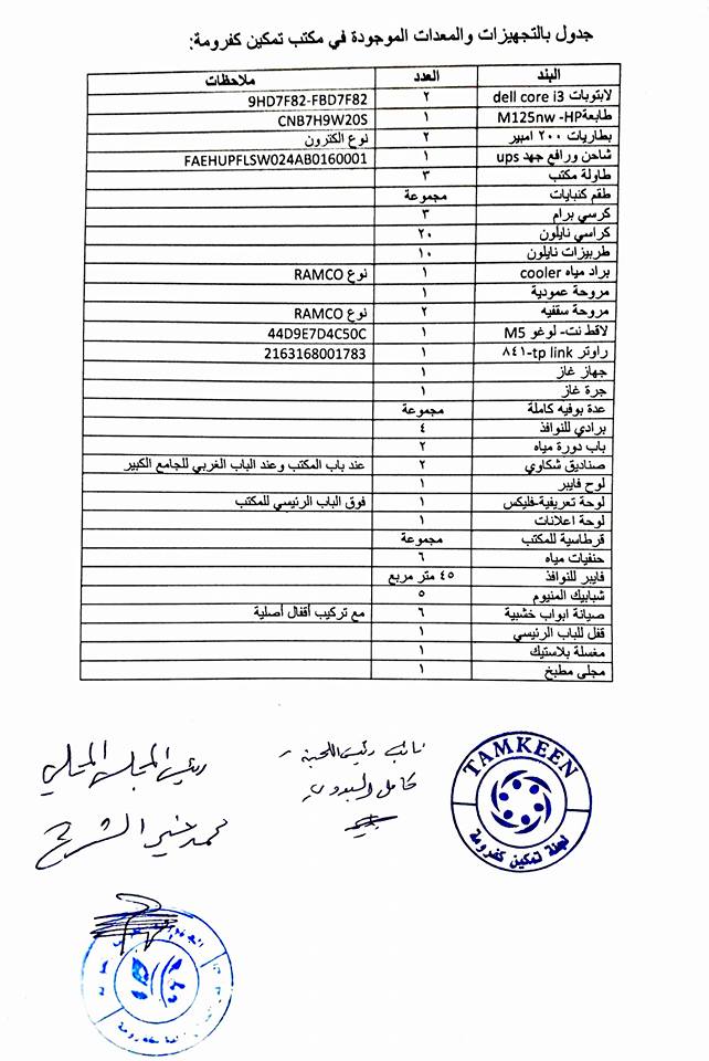 تقرير حول التجهيزات والمعدات الموجودة في مكتب لجنة تمكين في بلدة كفرومة