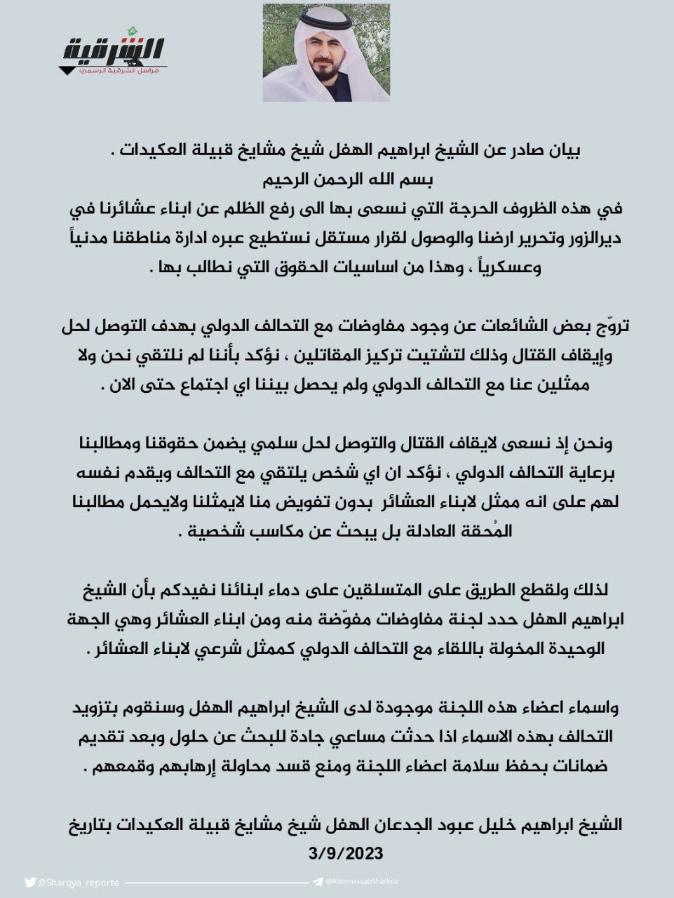 لذلك ولقطع الطريق على المتسلقين على دماء أبنائنا نفيدكم بأن الشيخ إبراهيم الهفل حدد لجنة مفاوضات مفوّضة منه ومن أبناء العشائر ، وهي الجهة الوحيدة المخولة باللقاء مع التحالف الدولي كممثل شرعي لأبناء العشائر . وأسماء أعضاء هذه اللجنة موجودة لدى الشيخ إبراهيم الهفل، وسنقوم بتزويد التحالف بهذه الأسماء إذا حدثت مساعي جادة للبحث عن حلول وبعد تقديم ضمانات بحفظ سلامة أعضاء اللجنة ومنع قسد محاولة إرهابهم وقمعهم.