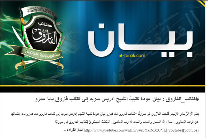 بيان كتائب الفاروق حول عودة كتيبة الشيخ إدريس سويد إلى صفوف الفاروق