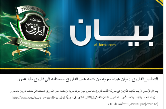 بيان كتائب الفاروق عودة سرية من كتيبة عمر الفاروق المستقلة إلى صفوف الفاروق في حي بابا عمرو