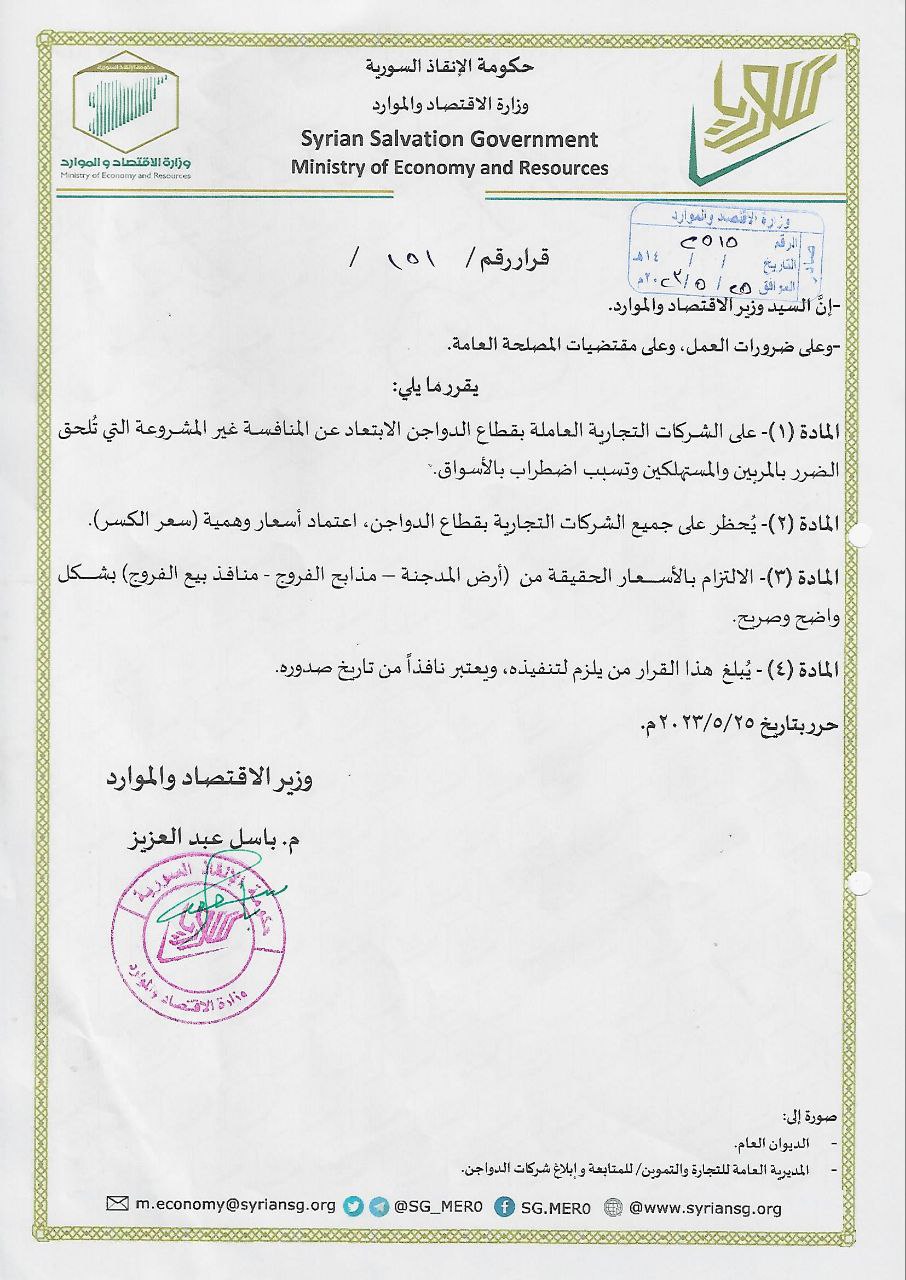 قرار من وزارة الإقتصاد والموارد في حكومة الإنقاذ تفرض فيه على الشركات العاملة في قطاع الدواجن الالتزام بالأسعار الحقيقية وتجنب نشر أسعار وهمية