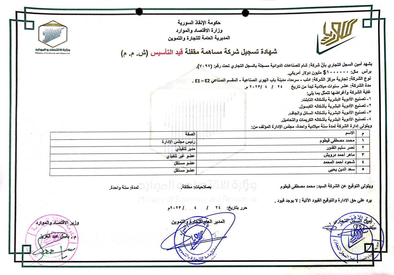 بيان من وزارة الاقتصاد والموارد في حكومة الإنقاذ السورية حول منح شهادة تسجيل شركة مساهمة مقفلة لشركة شام للصناعات الدوائية