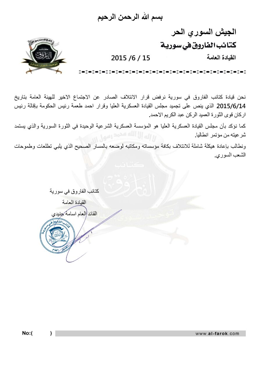 نحن قيادة كتائب الفاروق في سورية نرفض قرار الائتلاف الصادر عن الاجتماع الاخير للهيئة العامة بتاريخ ١٤ \ ٦ \ ٢٠١٥ الذي ينص على تجميد مجلس القيادة العسكرية العليا وقرار أحمد طعمة رئيس الحكومة بإقالة رئيس أركان قوى الثورة العميد الركن عبد الكريم الاحمد .